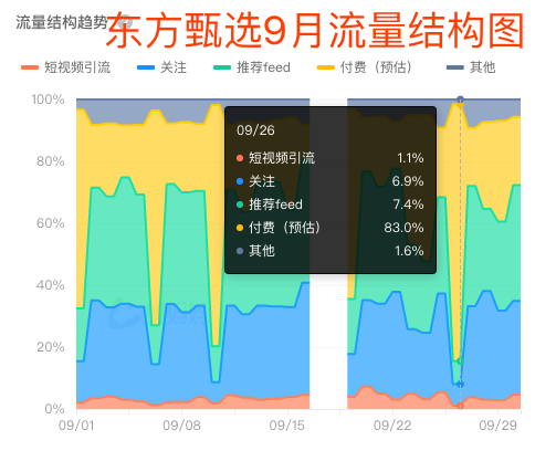 平台推流占比少的另一个原因是,东方甄选的大手笔付费流量占比过高(请看上图绿色框),9月份,他们的付费流占比高达45.9%,与辉同行只有13%,交个朋友也只有15.9%,在另一份数据中,我们看到,东方甄选有的大场活动,付费流占比高达83%: