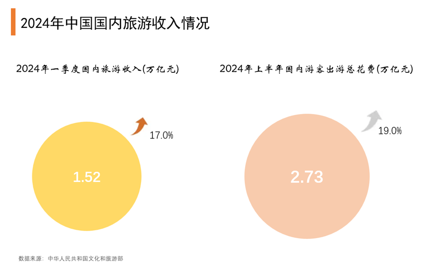 在今年,2024年一季度,国内旅游收入1.52万亿元,同比增长17.0%,首次超过2019年同期。2024年上半年,国内游客出游总花费2.73万亿元,同比增长19.0%,显示出旅游市场的强大消费潜力,也为全年旅游市场的表现奠定了坚实的基础。