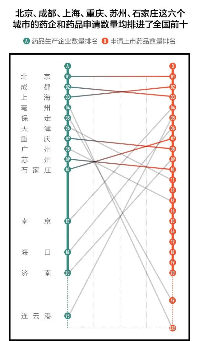 第一财经2022年3月时做过一个国内药谷的评选,在一众大城市的包围下,连云港突然冒了出来,从上图可以看到它就是个异类,其他城市药企数量最少也能排在全国前二十,到它居然只有95,才24家。