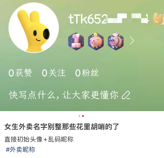几分钟后,来拿外卖的很可能是蹦蹦跳跳的年轻小姑娘。95后老张是一个长期独居的“过来人”,她告诉我们:“用不好惹的名字,可能是因为自己平时太好惹。”“我家小区是塔楼,从小区门口到家里有三道门禁,上下电梯需要刷卡,有时候外卖员上不来,只能打电话沟通,确认他进电梯之后我在楼上帮按电梯取餐。去年,有一次是外卖员把餐扔在了一楼,打电话沟通,对方明确表示没法送,想继续争论,结果电话被挂了。因为小区结构特殊,我点外卖经常被凶,一个人独居,既不敢投诉,也不敢争论,只能自己生闷气。后来学网上的样子名字改成了‘刀哥’,装出很冷漠很不好惹的样子,和外卖小哥的关系也就缓和了不少,原本的名字的头像,送餐时候都不好意思催促,对方经常已读不回,伪装成中年男性之后,沟通反而变得很有效率。”老张的遭遇不是个例,互联网上有很多类似的女孩求助帖。评论区里大家各抒己见,有人专门分享看似凶狠的男性头像。据老张介绍,这种方法初期有效,但并不能彻底解决问题,时间久了就会被拆穿,毕竟没有哪个大哥会在大晚上点奶茶、炸鸡、麻辣烫做夜宵。众多角色中,中年男人是最常出现的形象,多为第一眼看起来就“不好惹”的狠人。比如动作明星马东锡、UFC选手李景亮、墨镜光头大哥都是常见选项。换上极富安全感的头像,下一步还要模仿中年男人的昵称。某某健身教练,AAA水泥销售,五金销售......00后女孩荔枝向我们介绍:“这几年用过很多外卖化名、行者无疆、雪域战狼、亚洲拳王轮番用了一遍,导致现在小区经常送外卖的小哥,敲门时会笑着加一句龙哥你的饭来了。”因为叫“AAA建材李哥”ID的人太多,以至于该名称后缀1974-1988的数字,几乎都被占满。随着化名的使用者越来越多,起名方式也已经进化到Next Level。有人发帖:生活中,真的中年男人高山风景做头像,用太凶狠的头像只会欲盖弥彰。00后女孩兔子向我们分享了自己的化名经验:“中年男人的头像太容易被识破,我的延伸思路伪装成男大学生,用动漫帅哥、球星头像,更像真人。”有网友善于反向思考,使用系统自带的乱码昵称“大隐隐于市”。类似的集体化名现象,不止发生在外卖和快递行业,很多年轻人会在跟团旅行中也会用化名,因为不想自己的生活被打扰,出门在外身份和工作都是瞎编的。几年前,社交媒体中的粉色恐龙MOMO,在社交软件套上公共马甲,避免暴露真实身份。今天,外卖和快递平台上,大家化身龙哥、虎哥,用凶狠人设,希望化解冲突,自我保护。兔子告诉我们:“这是一种独居女性采取的自我保护措施,多数时候是为了正在合理捍卫自己消费者权利的同时,保护自己。在网购和点外卖时使用男性化名,可能会让潜在的不法分子感到警惕,从而降低被伤害的风险。”手动改名躲在凶狠的人设背后,可以看做是用一种相对简单的方式。数据显示,外卖用户中25-45岁间的女性用户占比较高,其中长沙18-30岁女性用户占比高达53%。另一组数据可以看到,目前中国有超过7700万成年人处于独居状态,“单身经济”使得一人食成为主要就餐方式,而未婚单身的独居年轻人恰好属于外卖主力消费人群,占比高达44.6%。在网上,真实姓名可能带来不必要的风险,人们往往需要选择一个公开的身份,因此,年轻女性开始使用男性化名来避免暴露自己的真实身份,以减少潜在的麻烦。“有一次点了家附近的外卖,距离几百米,结果快一小时才送来,我下楼拿的时候小声嘟囔了一句,有这个时间我都吃完了,结果外卖员从我手里抢走了外卖,说那你别吃了。”“当时感觉很无力,这种感觉是独居女孩特有的,身边没有家人和男性朋友,在软件中给出差评又担心被找上门,我不认识邻居,也没有宠物,所以想到用这种方式保护自己。”“尽管我知道作用有限,但也算是一种‘自我安慰式的自我保护’,这种化名行为在男性的生活中很难察觉,但的确是真实存在的。”“为了保护个人信息和隐私,这几年陆续学会了用记号笔、打火机涂改小票。”“开始在不同平台起不同的名字,比如在美团平台下单叫A女士,饿了么平台叫B女士,这样就可以知道自己的信息是从哪里泄漏的。”兔子相信这些举动也许不能从根本上解决问题,但使用男性化名还是一定程度上提高了自己面对潜在危险勇气。真正的安全感需要依靠社会、平台、个人防范措施等诸多方面共同营造。