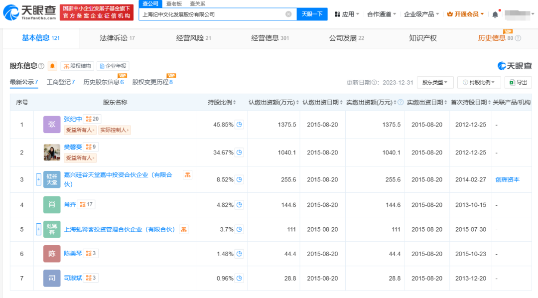 信息显示,该公司成立于2012年12月,注册资本3000万元,张纪中前妻樊某蔓为法定代表人,持股34.67%;张纪中持股45.85%为第一大股东。