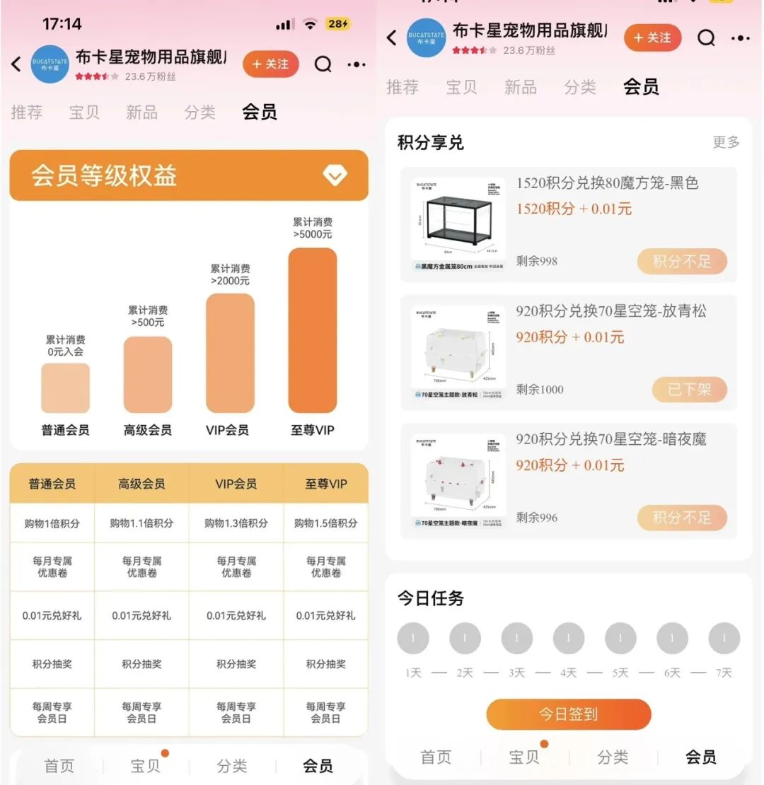 据布卡星创始人的公开采访,其营销费用在成本中占比不到 10%。除了常规的节点营销,品牌并未进行大规模广告投放,而是通过优质内容撬动免费流量。同时,布卡星还极其重视会员和私域的运营,其在淘系平台季度复购率达 46%。小红书和抖音是宠物类品牌内容营销的主战场。布卡星在成立次年就入驻了小红书,目前在小红书有 2 个官方账号,粉丝近 7 万,累计已发布笔记 565 篇。主号的笔记内容按“吱识星球”、“品牌宣传片”、“造景搭配”、“产品介绍”等主题进行分区。类似的,布卡星在抖音已开设三个官方账号。其中主号粉丝 7.8 万,累计发布近 800 个作品,也按照“吱用品”、“鸟鸟好物”、“小吱识”、“吱屋造景”、“吱日常”等内容进行了分类。布卡星内容运营的核心逻辑是在给足用户情绪价值的基础上,夹带软性的营销内容。其中“吱识星球”(“小吱识”)主题是以图文内容为主,以可爱轻松的插画和详细的文字向目标用户进行系统性的小宠物饲养知识科普,例如新手养仓鼠之前要做的准备、如何与刚到家的仓鼠培养感情、如何找回越狱的仓鼠等。抖音数据显示,布卡星的几类内容合集中,“小吱识”的播放量最高,达 568 万,可见小宠物主对知识科普类内容的高接受度。“造景搭配”(“吱屋造景”)的主题则通过短视频内容向用户输出自家不同仓鼠笼产品、不同风格、不同季节的造景教程和装饰物搭配小 Tips,边输出干货边完成种草。这类内容的关注度比较高,部分粉丝会在布卡星的评论区催更。在造景合集下,布卡星还会发起造景 UGC(用户参与内容生产)的活动,例如圣诞造景、联名款造景等,邀请用户带上话题晒出相关造景图片及视频。获奖者可得到相关仓鼠笼装饰物、玩具、无门槛优惠券等奖品。在满足目标用户“晒娃”需求的同时,又能给自家产品带流量。此外,运营社发现布卡星还选取在年轻人中较受欢迎的 IP 进行联名营销,例如与小黄鸭 Bean Duck 合作推出系列主题款小宠用品及外带笼,助其有效扩大品牌声量。小红书上#布卡星小黄鸭联名 话题下已有超 1 万篇笔记,部分点赞数高达 2500 以上,评论数过百。以淘宝、天猫为首的货架电商仍是布卡星营收的主要来源,而小宠物用品属于复购率较高的品类,因此,布卡星也十分重视天猫平台的会员运营。截至目前,布卡星天猫旗舰店已积累粉丝 23.6 万人,店铺铁粉过万,消费者季度复购率达 60%,在鼠类用品店铺中人气指数排名第一。运营社发现,布卡星在针对会员的提频和复购,设置了两种会员体系。一是付费的储值会员。这类会员可享受充 500 得 520、充 1000 得 1050 的会员购物金。购物金全店通用、可叠加使用、一年内可退。二是免费的等级会员。以累计消费金额 0 元、500 元、2000 元、5000 元划分会员等级。不同会等级的员可享受不同倍数的购物积分、每周专享会员日、每月专属优惠券、积分兑换商品、积分抽奖等权益。同时,布卡星还会进行入会引导——成为会员后,可参与抽取会员积分、无门槛优惠券以及垫材、营养粮、跑轮、造景笼等商品。相比于猫狗,小宠品类在私域运营方面有着天然的圈层优势。小众宠物的饲养者乐意加入私域社群分享养宠心得,并从社群中获取更多养宠信息和产品优惠。目前,布卡星已通过讨论群、福利群、产品群等形式加码私域运营。截至 2023 年 3 月,其已运营几十个私域社群数,人数已达 3 万人。布卡星的私域客群主要来自产品用户以及活动裂变。将目标客户导入社群前,布卡星会对小宠爱好者饲养的宠物种类、所处城市等信息进行登记,便于后续对私域人群进行分流。布卡星没有把私域纯粹当做一个发放优惠券的渠道。运营社发现,内容和用户分层是布卡星运营社群的两大抓手:第一,布卡星会通过养宠心得讨论、养宠知识科普等多种方式去丰富社群内容,还会在社群中不定期举办造景大赛、仓鼠颜值大赛,让群友投票评选,并主动引导用户产出优质 UGC。第二,基于对用户进行入门、进阶的分层,布卡星可以精准针对社群中不同层次的用户采取不同的运营策略。例如,给予核心用户免费内测新品的机会,使其体验小众圈层中的优越感,并根据其反馈改进产品,通过“养成系”策略提升品牌忠诚度。布卡星的私域运营突出兴趣与共创,并借此深度地链接目标用户,提升社群的整体活跃度和用户粘性的同时,也为后续新品的打造与传播创造了有利条件。售价243元的仓鼠笼,能赚多少?