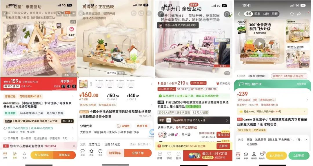 布卡星70cm星空笼各部分材料价格表据此计算,布卡星 70cm 星空笼基础款的总成本约为 100 元,其毛利率达 58%,对于非高技术含量的商品来说,这个毛利率已算可观。但是与 95后 群体同样钟情的盲盒等潮玩商品相比,这样的利润并不算高。泡泡玛特招股书显示,其售价 59 元的盲盒成本仅为 15 元,定倍率约为 3 倍,而上述造景笼的定倍率约为 2.43 倍。运营研究社对比了另一家在淘宝同样月销 10 万+、在淘宝鼠鼠用品店铺榜排名第二的店铺卡诺。其中,卡诺的热门款——62cm 的“小电视”在拼多多售价 219 元。同等体积下,卡诺的仓鼠笼产品定价略高于布卡星。若以 1688 价格为成本价计算, 62cm 卡诺小电视毛利率约为 37.7%;以材料成本价计算,其毛利率均高于布卡星。相比之下,布卡星的产品性价比更高,叠加其以运营建立的品牌认知,不难理解它为什么能做到天猫小宠物类目下的销量 TOP 1。但因国内电商产业发达、消费者选择面广,布卡星尚未成为小宠物用品赛道中绝对的头部品牌。从电商平台销量来看,布卡星虽在淘系平台的鼠类用品热卖榜排名第一,但在拼多多的宠物用品店铺畅销榜中暂居第二,在抖音平台,布卡星的累计销量较卡诺少了近 40 万。在小宠食用品的更多细分类目中,均有销量可与之一战的品牌。当前,国内小宠物赛道已成长为百亿级的蓝海赛道,其市场规模仍在高速增长。同时,小宠物食用品的技术门槛不高,市场集中度较低,消费者还未形成很高的品牌忠诚度。拥有供应链优势的商家仍然有在小宠物赛道淘金的机会。