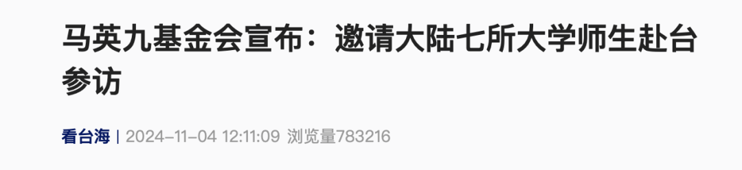 马英九基金会执行长萧旭岑11月4日宣布,马英九已邀请包括大陆北京大学、清华大学、复旦大学、中山大学、浙江大学、福建师范大学、北京体育大学等七所大学共40名师生,于今年11月27日访问台湾九天八夜,与台湾六所大学交流,并参访台湾著名景点。萧旭岑表示,在两岸关系空前紧张,格外需要民间交流的时刻,大陆这几所著名大学的同学来访,实地与台湾的大学同学互动,有助于纾缓两岸气氛,传达更多和平讯息。让两岸的年轻人多往来、多接触,对两岸关系发展非常重要。来源 / 环球网、看台海