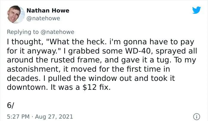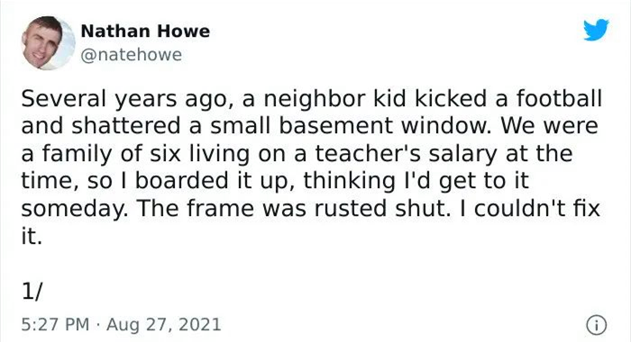 推特网友Nathan Howe自曝,5年前,家里的窗户被一个小孩的足球砸破了。