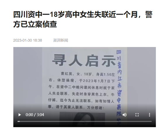 2023年1月7日,四川资中一名18岁的高中女生已经失联近一个月,家人把寻人启事贴满了大街小巷.......