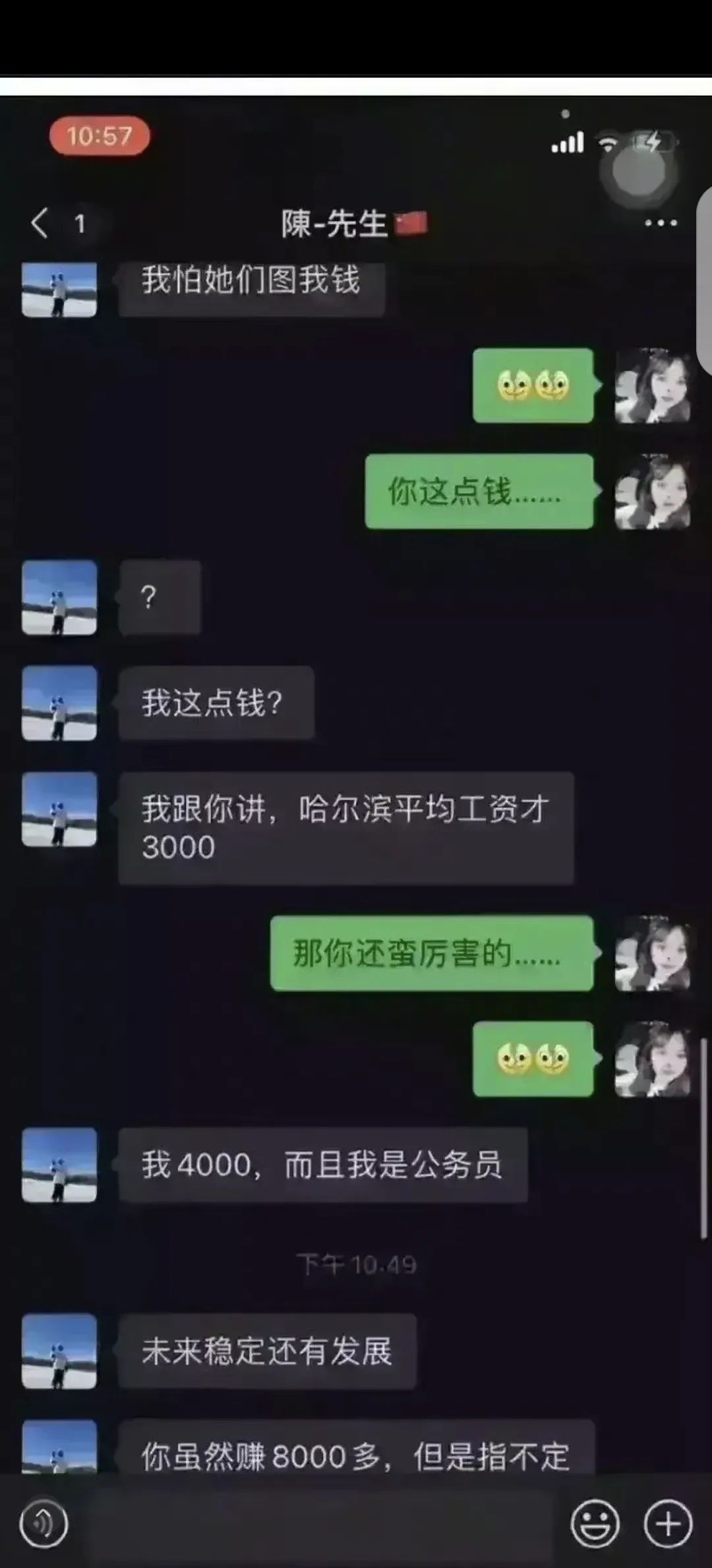 “我跟你讲,哈尔滨平均工资才3000,我4000,而且我是公务员!未来稳定还有发展。”