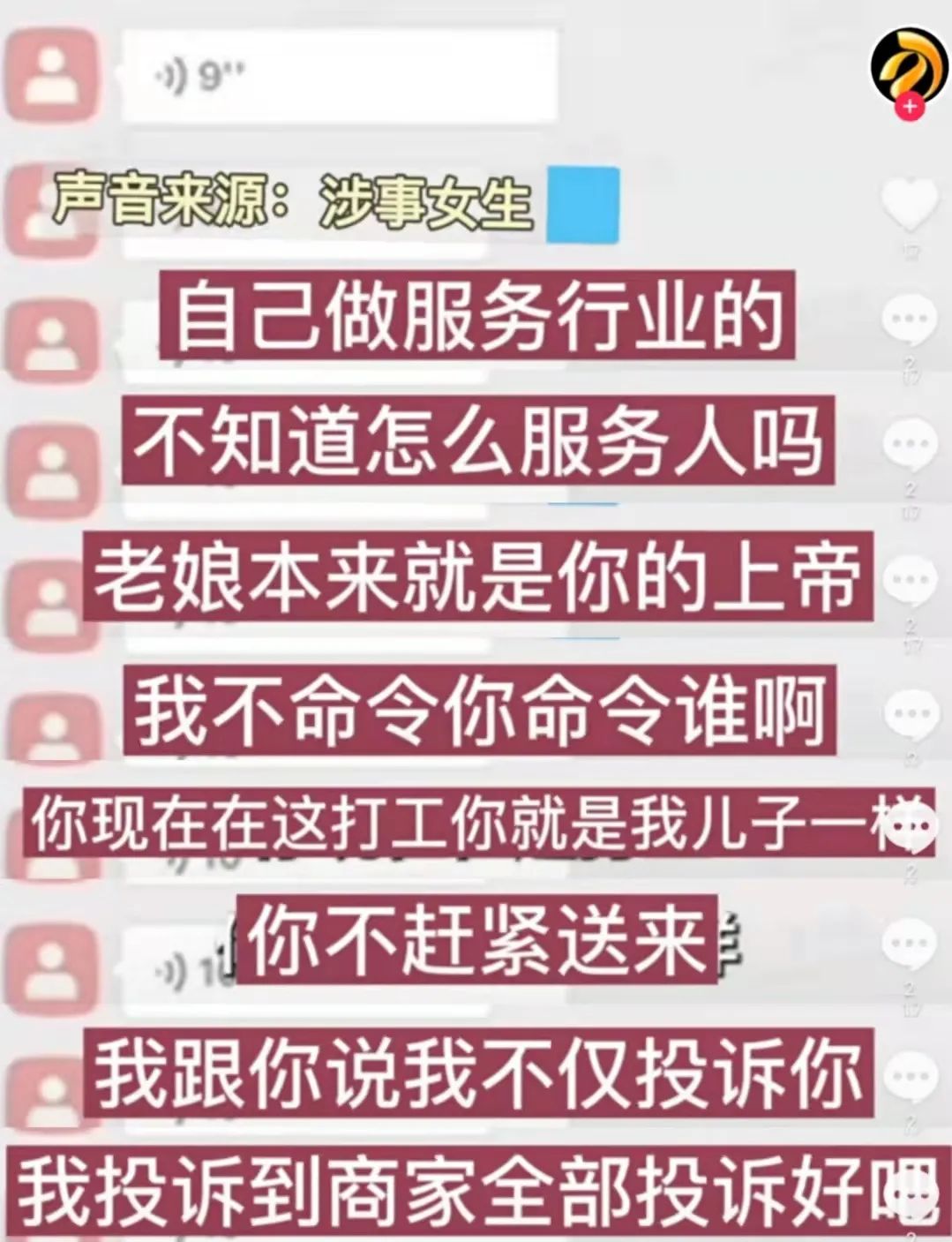 没想到女生一听,竟破口大骂:“服务行业不知道怎么服务人?老娘就是上帝,不命令你命令谁?你打工就像我儿子!敢不给我送来,马上投诉你!”