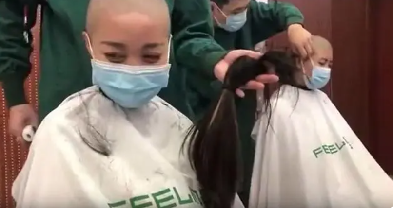 在理发现场,许多医护看着自己留了多年的长发被全部剪掉,不由得双眼发红。