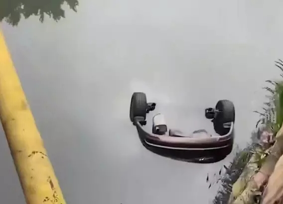 从第二天拍摄的图片上看,小轿车整个翻躺在河里,车身几乎全部被淹没。