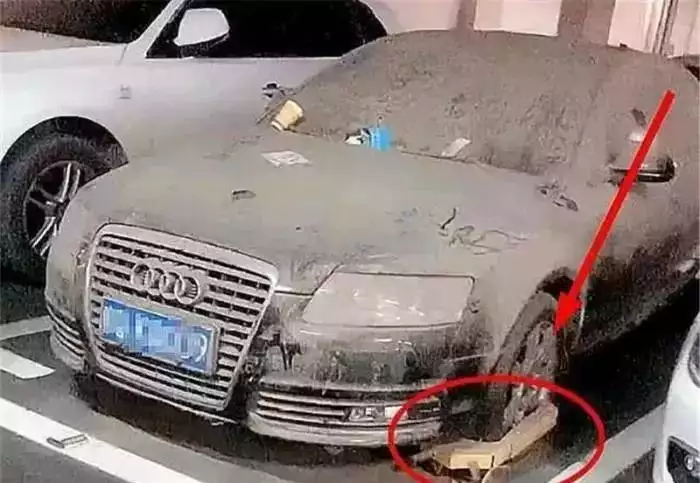 一辆奥迪车在地下车库停了两年,落了一身车灰。