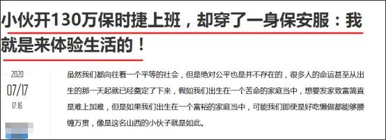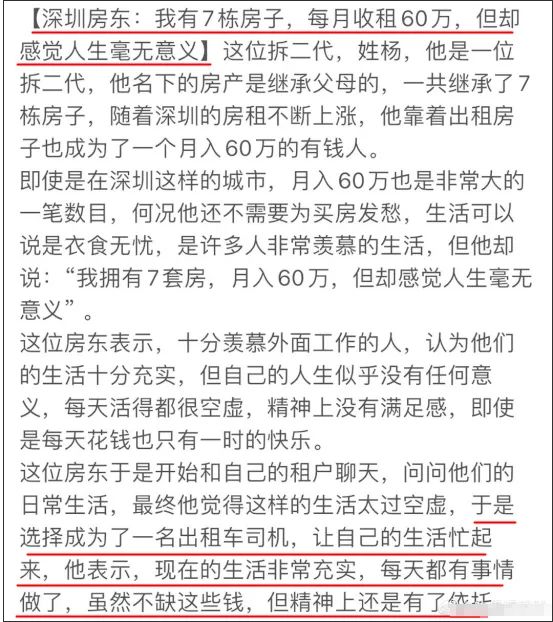 有的人,或许真的不是和我们生活在同一个世界里面的。他家里有7栋房子收租,是继承父母的房产,随着深圳的房价水涨船高,他靠这些房子,每个月可以收租60万。但是他觉得人生没有意义,为了体验生活,寻找生命的真谛,他选择当一名出租车司机,让自己的生活充实起来。现在,他感觉自己的生活很充实,每天都有事情做,虽然不缺钱,但是精神上有了依托。这个小伙的故事在网上刷屏之后,网友们纷纷表示羡慕和酸哭了。还有人说,那就把7栋楼要收租的房客编个码,今天收这个,明天收这个,那就不会无聊了。其实,这就是我们生活中的“隐形富豪”,感觉人生没有什么意思,出来当一个出租车司机,只是为了体验生活,寻找生命的意义,充实一下自己而已。这也并不是个例,随着经济的发展,有钱人越来越多,而像这样藏在我们身边的“隐形富豪”,也越来越多。据媒体@奋进车生活报道,山西有一个小伙在某小区当保安,每天兢兢业业上班,拿着2300每月的微薄工资。然而人们发现,这个小伙很不一般,他抽的烟,是一般人根本消费不起的华子。而更让人震惊的事情还在后面,这名小伙的座驾是一台保时捷帕拉梅拉,价格有130万元,如此豪车,他也只是拿来当代步工具。原来,他是一个货真价实的富二代,父亲是当地某集团的董事长,而这名小伙之前浑浑噩噩,对赚钱提不起什么兴趣,于是就干起了保安,体验一下生活。在他的店子里面,鸭肉 +青菜+鸭汤,还加无限续饭,仅仅只要12元。记者问他:“你为什么能卖那么便宜啊?挣得一定很少吧。”老板笑着说:“挣得少,但是我生活得很开心。因为我有十栋房子收租。”大叔还说,他买了宝马专门用来装菜送货,自己非常享受这种简单而又快乐的生活。在上海,有个创业公司的资金链断裂了,眼看就要关门的时候,公司里一个清洁工阿姨拿出600万给公司完成了融资,挽救公司于水火之中。阿姨投资的理由也很简单,她说就喜欢公司的氛围,希望大家都不要走。还有某烧饼摊大爷,他白天在灶前卖烧饼,晚上回到几百平的房子里面喝红酒。我们的生活中藏着太多的“隐形富豪”,我们出来工作,是迫于无奈,生活所逼,而他们出来工作,只是生活太枯燥,出来寻找简单快乐的生活而已。比如说前面那个深圳开出租车的小伙,他觉得当出租车司机很有意义,能够感受到快乐,其实这并不是出租车司机这个职位给他的,而是他有6栋房子出租,不用为生计发愁。还有那个卖鸭肉饭的大叔,他能够保持鸭肉饭不涨价,买了宝马专门用来买菜,他感觉自己的生活简单又美好,这也不是这个工作本身带给他的,而是他有十栋房子收租,不要靠卖鸭肉饭赚钱。人和人之间是不同的,有的人为了生计,不得不疲于奔命,甚至要打几份工,而有的人出来只是为了体验生活,享受简单又美好的生活,不求赚钱。然而,后面这种人就总是喜欢劝前面的人想开一点,觉得赚钱不重要,要去享受生活,生命应该活得更有意义。他们总是说,不要只知道赚钱,不要急着买房,应该去追寻更重要的东西,不要被物质和金钱束缚,要去追寻更有意义的东西,豁达、看开一点,不要被眼前俗气的东西蒙蔽。比如“赚钱毫不费力”的高晓松,呼唤:生活不止是眼前的苟且,还有诗和远方。比如跻身富豪榜、曾是地产大佬的王石,他说:现在的年轻人都太急躁了,整天只想着赚钱,应该把精力更多地放到公益或者探险上去。说白了,那些把上班当体验的人,他们想任性就任性,想不去上班就不去上班,只是因为他们有任性的资本,而我们普通人如果跟随他们的脚步,马上就会遭遇生活的毒打。飞机上,一只鹦鹉对空姐说:“给爷来杯水”,猪也学鹦鹉,对空姐说:“给爷来杯水”,空姐大怒,将鹦鹉和猪都扔下了飞机。这时鹦鹉对猪说:“傻B了吧,爷会飞”,而猪最后摔死了。鹦鹉不过是因为自己有一双翅膀,所以在惹怒空姐之后还能成功逃生。但我们如果真的学有钱人那样,觉得赚钱不重要,生命应该更有“意义”,一旦发生什么变故,你拿什么来应对?没有资本还学着人家“佛系”,到时候苦逼的只有自己。经济基础决定上层建筑,所有一切优雅、体面的背后,都是因为他可以卸下身上的经济压力,有机会、有资本去守护一个理想的东西。