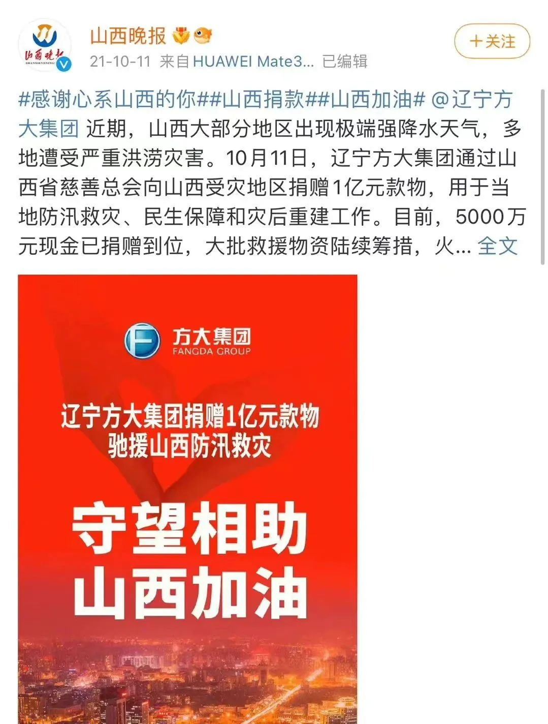 就是那个在山西严重洪涝灾害中,送去1亿物资的辽宁方大。