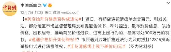 一盒原本20多的连花清瘟,现在单盒售价高达百元。