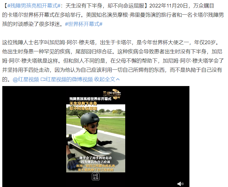前段时间,世界杯在卡塔尔开幕,一位只有上半身,用双手支撑身体行走的男孩出现在海湾球场中央,他微笑着与好莱坞明星摩根·弗里曼交谈,这一幕,吸引了全世界的目光。