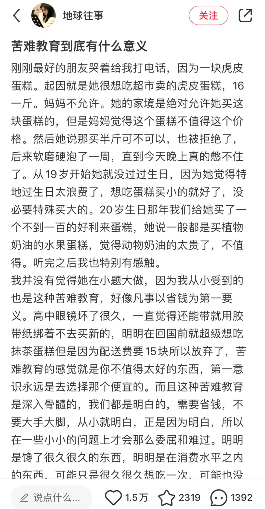 发帖人对此深有感触,因为她从小受到的也是这种苦难教育,凡事都以省钱为第一要义。
