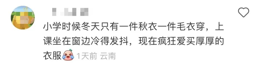 “小学时候,冬天只有一件秋衣一件毛衣穿,上课坐在窗边冷得发抖,现在疯狂爱买厚厚的衣服。”