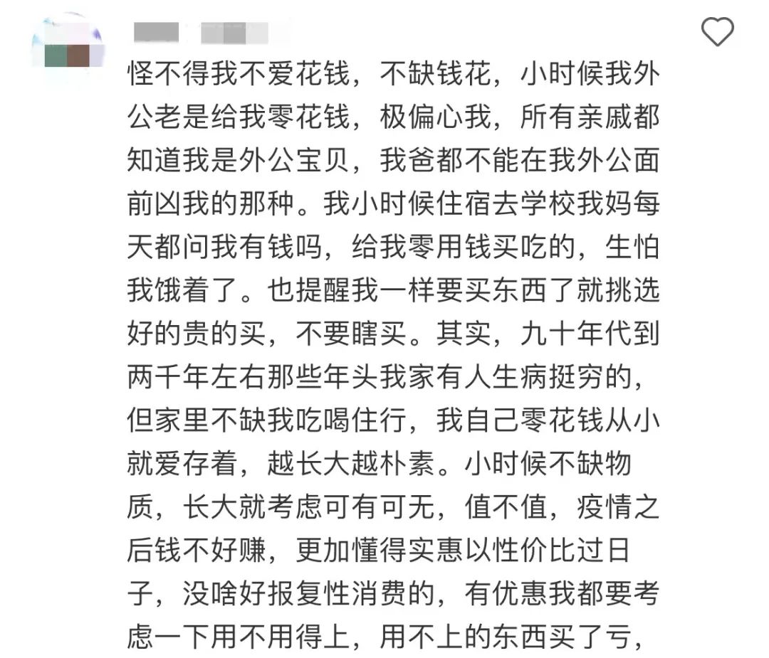 “小时候不缺物质,外公极其爱护我,我妈也提醒我买东西就挑好的贵的买,不要瞎买。