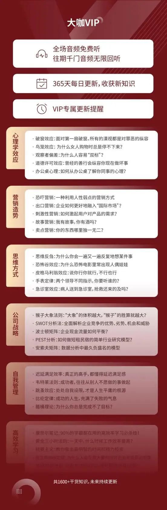 基于MBA智库平台超过42万的条目库精选制作,现在已有超过1600+音频,大咖讲百科通过语音讲解知识点+案例的方式,让你在5-8分钟的时间内,不仅学会一个难懂的专业知识,更重要的是帮助你从一开始就要养成正向的思维,进而影响你的知识、思想、行动。
