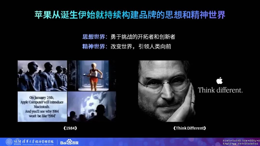 苹果有一些非常经典的广告,比如《1984》、《think different》,都非常深入人心。苹果从诞生伊始,就持续构建品牌的思想和精神世界。它构建的思想世界,是勇于挑战的开拓者和创新者;它构建的精神世界,是改变世界,引领人类向前。这样的理念和价值主张,是跨人群、跨国度的普世价值。