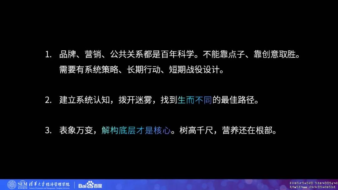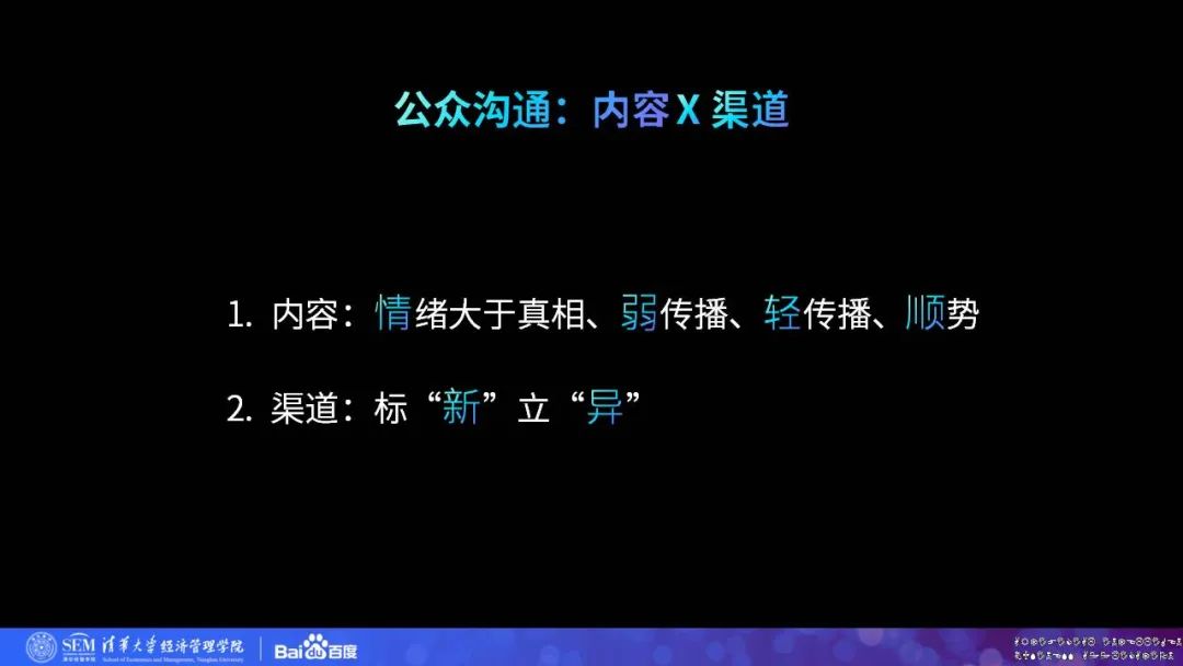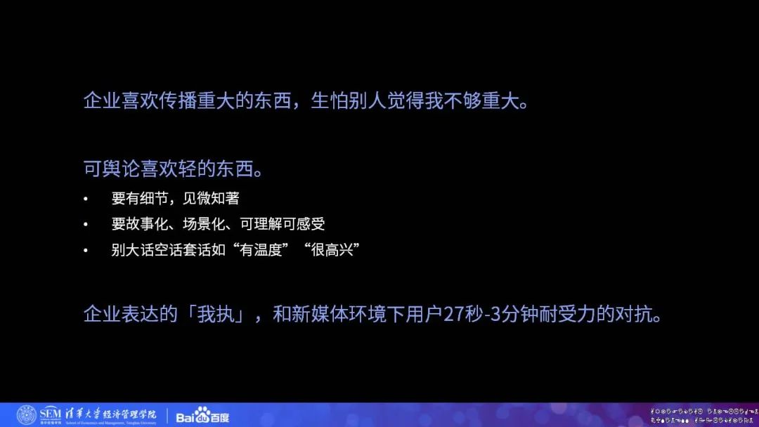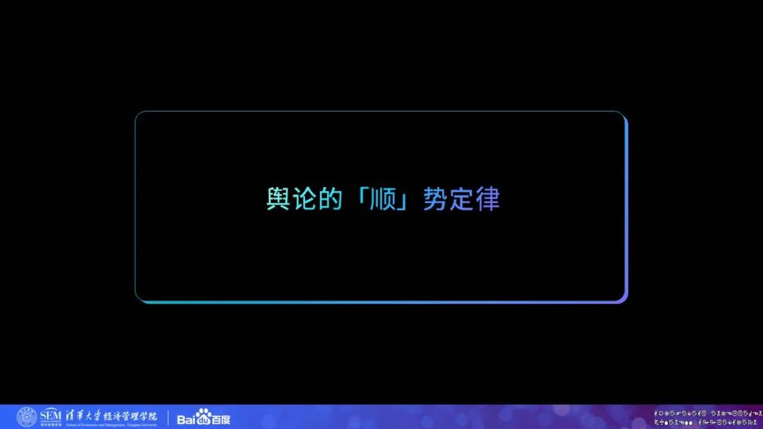 还有一个是顺势定律。对于企业的发展,最重要都是顺势,不管是技术潮流的势,还是说用户需求的势,在传播上更是如此。不管像清华大学这样的品牌,像百度公司这样的品牌,它其实每天都有大量的用户在讨论它。你只需要去了解,理解,用户自然讨论的是什么,他自然的兴趣点在哪里,你就能找到和他沟通的话术。