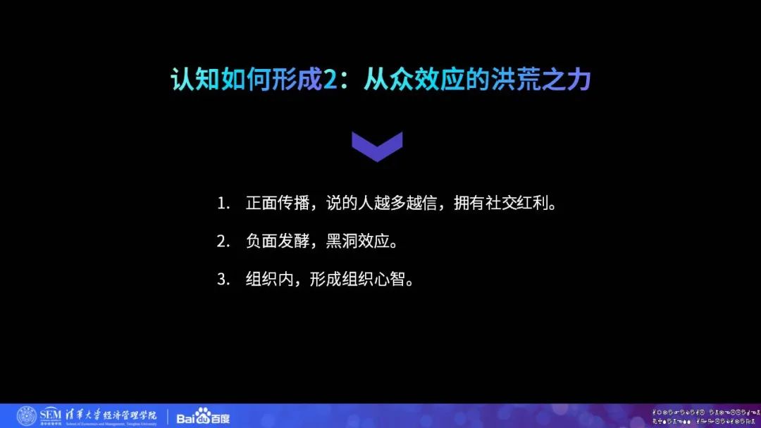 第二个很重要的、影响人们心智认知的是“从众效应”。一个认知形成的过程很复杂,有一些是很难去抵抗的。但你了解这些之后,去认识自己或者做管理,都是有价值的。这就是在最终的心智形成过程中,一家企业或者一个品牌,正面传播说的人越多越信,拥有社交红利。这是指,当越多人在讲肯定的话的时候,你愿意去分享,得到支持的可能更大。那负面同样如此,当负面被反复地说的时候,那讲负面会成为一种政治正确。负面发酵,形成黑洞效应。当你是一个企业家,你在做组织管理的时候,也要去关注。当一个企业经常在鼓励一种行为的时候,时间长了会形成组织心智。
