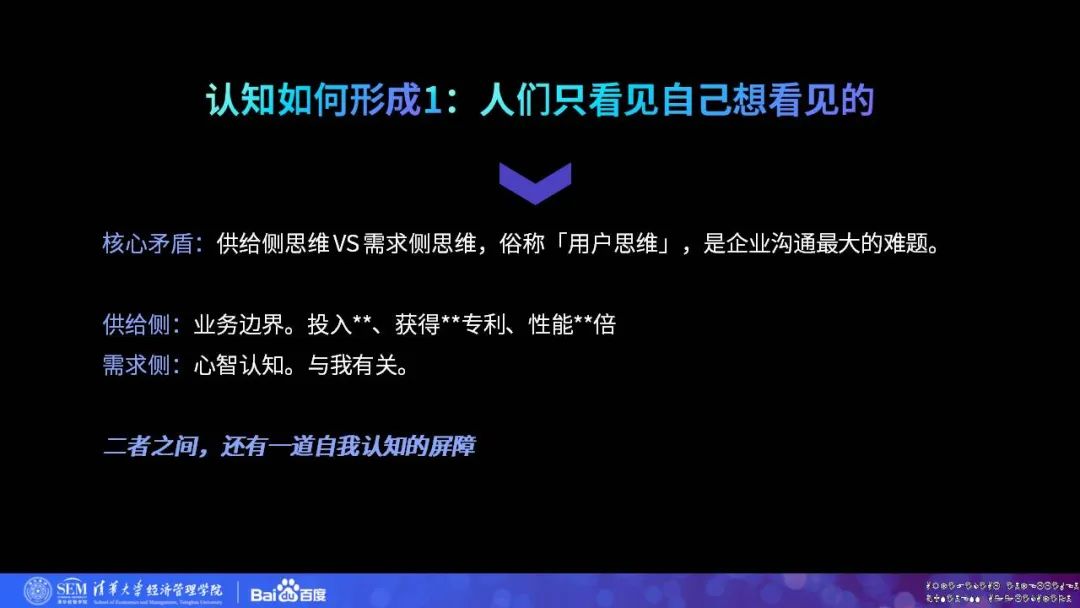 两者之间,还有一个自我认知的屏障。企业和个人都是一样的,我们通常认为自己比自己实际情况更好,这个屏障进一步障碍了我们的有效沟通。企业沟通最大的问题,所有的企业都一样,包括百度等其它企业,喜欢秀肌肉,喜欢讲我很厉害,这叫供给侧思维严重,用户一脸懵,不知道你在说什么。