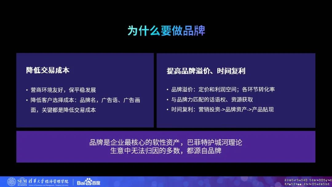 从前面的讲解,主要是让大家理解,一个产品的存在不会自然地就形成品牌,它会受很多的沟通的影响。那为什么要做品牌?我再重述一下,对一家企业来讲,做品牌是为了降低交易成本,不管是对你的客户、用户,还是投资人、合作伙伴,当你是一家更值得被信赖的企业的时候,别人更愿意选择跟你去合作。