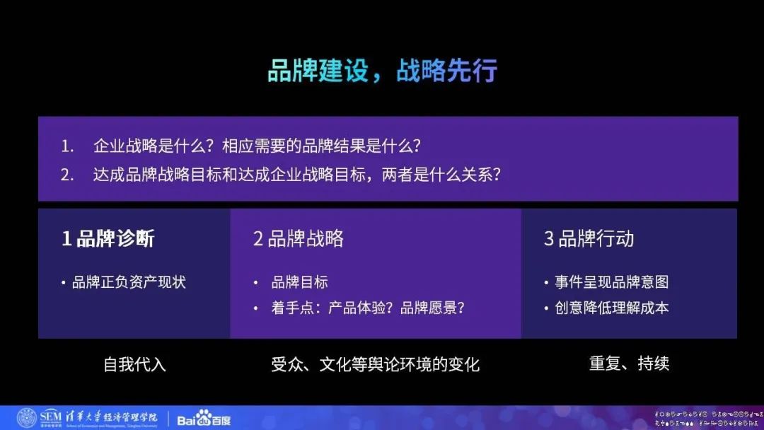 在一家企业做品牌,到底是根据什么去做?企业所有的事,都是围绕它的战略成功去做的。所以,品牌建设,战略先行。你首先要去理解,企业的战略是什么?企业的战略需要什么样的品牌结果?那两者的成功是什么关系?