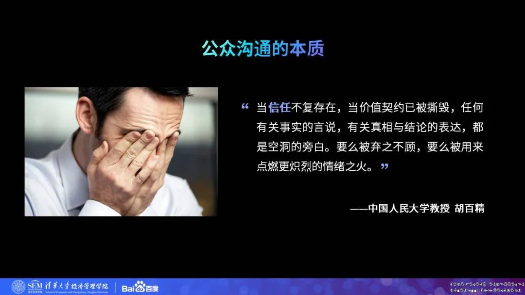 从公众沟通的本质来看,当一家企业产生了恶性事件的时候,你已经失去了公众的信任,公众在质疑你,用户在质疑你。用中国人民大学胡百精教授的话说就是,“当信任不复存在,当价值契约已被撕毁,任何有关事实的言说,有关真相与结论的表达,都是空洞的旁白。要么被弃之不顾,要么被用来点燃更炽烈的情绪之火。”
