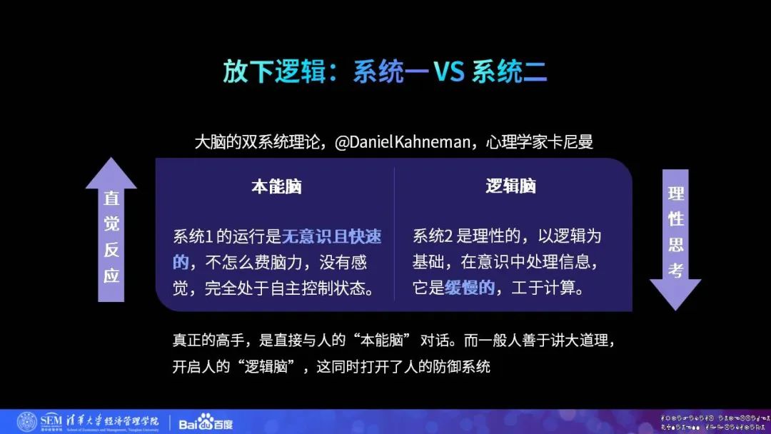 底层的原理其实是卡尼曼的大脑双系统理论,有一本书叫《思考,快与慢》。它讲的就是我们所有人的大脑都是这么运作的,你有个系统 1,它的运行是无意识且快速的,不怎么费脑子,没有感觉,完全属于自主控制状态;系统 2 是理性的,以逻辑为基础,在意识中处理信息,它的缓慢的,工于计算。