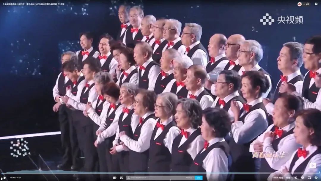 我举一个非常好的案例,是典型的轻传播。在清华大学 110 周年校庆晚会上,清华大学上海校友会艺术团献演《同一首歌》+《少年》合唱,当爷爷奶奶们齐刷刷卷起衬衫袖子的一刹那,年龄感消失了,生命的热力四射。这支清华校友合唱团的平均年龄达到了 75 岁,网友评论说,“又燃又感动”。