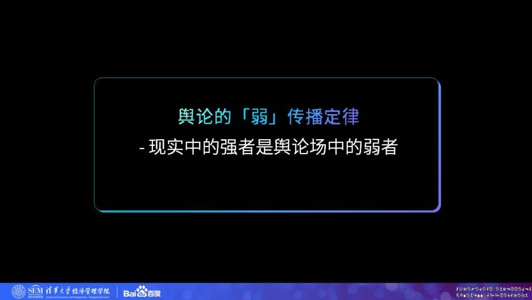 还有一个很重要的“弱传播”定律。厦门大学邹振东教授有一本书,就叫《弱传播》。现实世界中的强者是舆论场中的弱者,这也是过去很多年,大的企业在舆论上翻车很重要的一个原因。就是说舆论的天平它是天然向着弱势群体倾斜的。