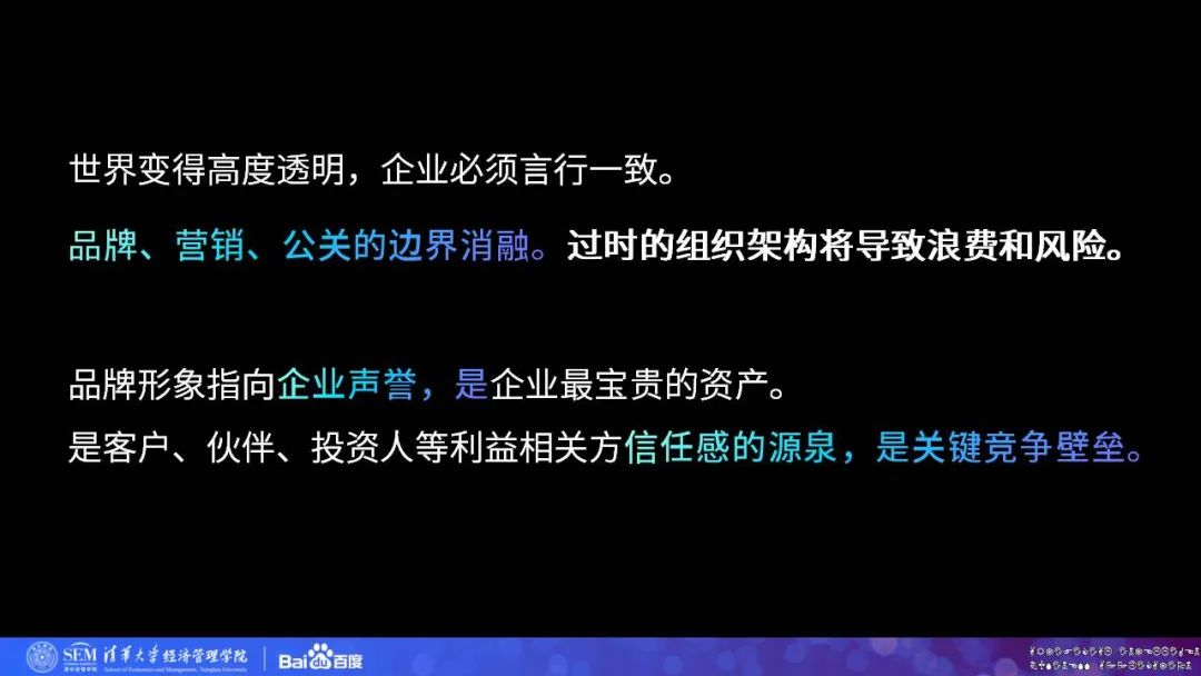 最后我想说,世界变得高度透明,企业必须做到言行一致,才会拥有好的品牌。对于管理者来讲,也需要理解,品牌、营销、公关的边界在消融,组织架构需要与时俱进,过时的组织架构将导致浪费和风险。品牌形象其实最终指向企业信誉,是企业最宝贵的资产,是客户、伙伴、投资人等利益相关方信任感的源泉,是关键的竞争壁垒。