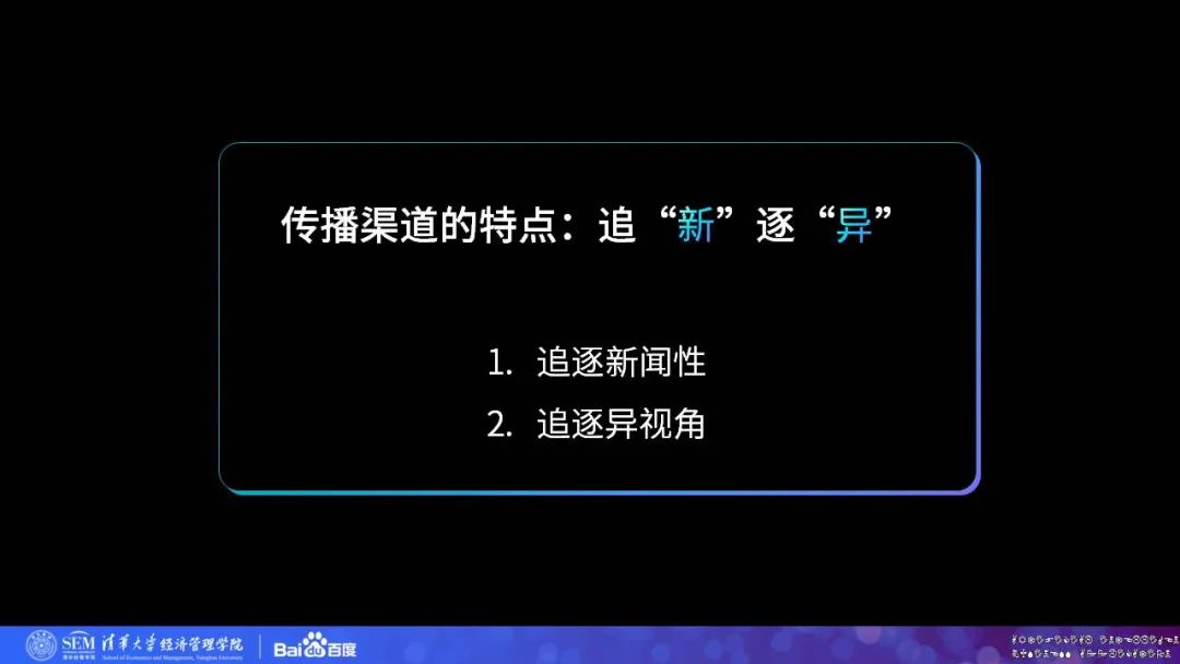 我再讲一下那个传播渠道的特点。大家不一定是做传播的,但是这些理念对大家会很有价值,就是怎么去认识媒体。我用了“追新逐异”这几个字,媒体天然是追逐新闻性的,同时它也会追逐不同的视角。所以你会发现说,为什么一个重大的新闻发生的时候,所有的 App 都抢着给你推送,然后推送完了之后,它还要继续挖别的新闻,因为它要在一个事件里面呈现不同的视角。