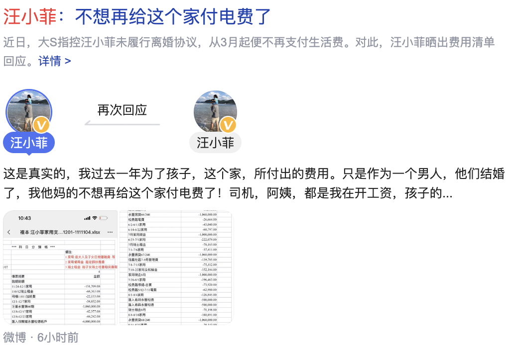 事情的起因,是汪和大S离婚后,需要按照离婚协议书上写的,支付两个孩子的抚养费和大S的生活费。