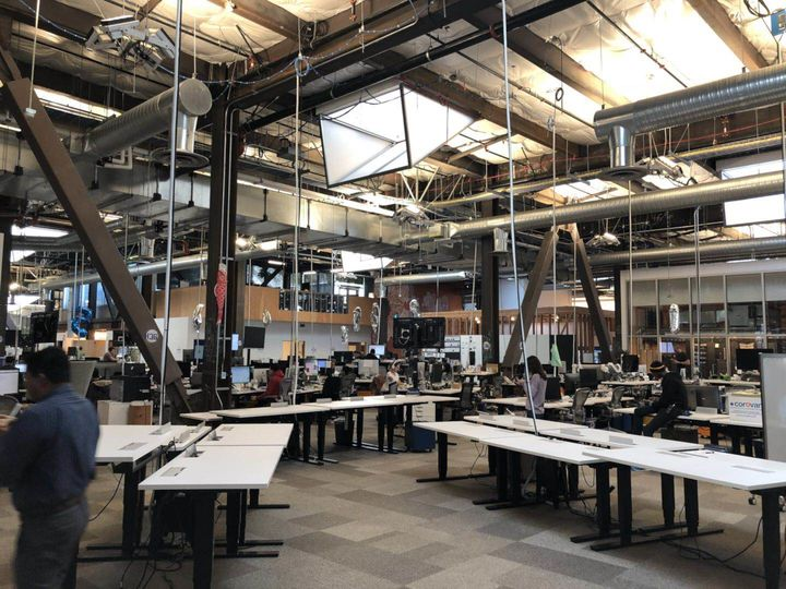 整栋楼三四层高,内部工业风,工位全打通,有几间玻璃隔断的小屋子是视频会议室。