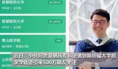 他在医学上的造诣很厉害,而更厉害的是他求学的经历,他的求学轨迹在网上吸引了500万网友关注。