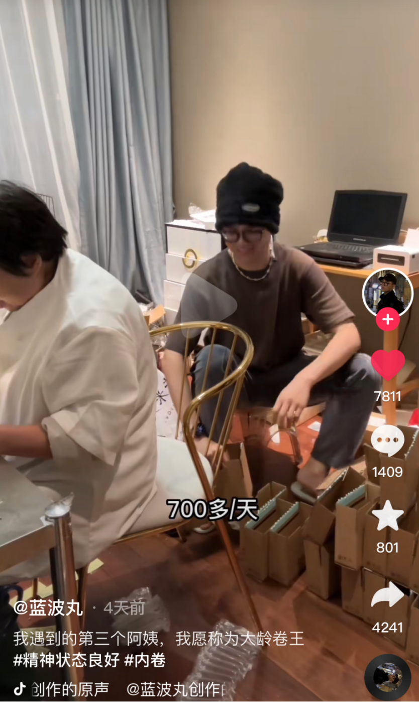 后来,因为他自己在卖货,就找了一个专门负责包快递的阿姨。