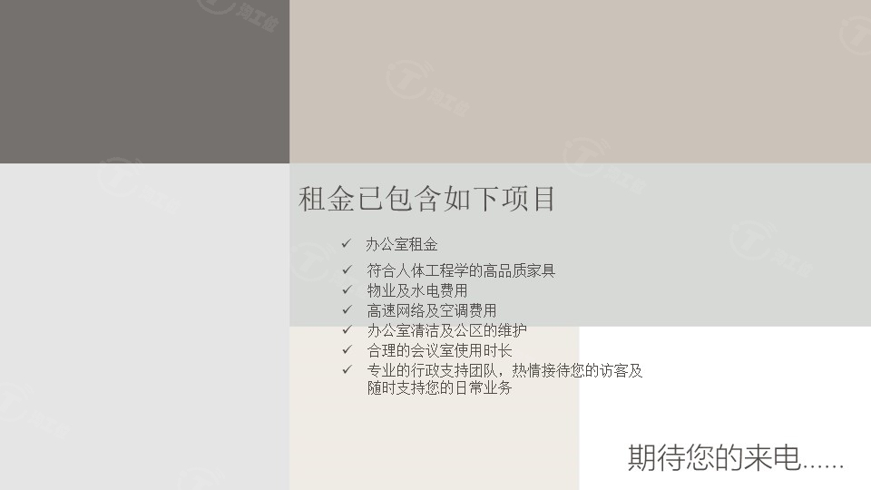 租金包含:前台服务、物管费、家具、水电、咖啡茶水、日常清洁、网络配置、打印复印、会议室