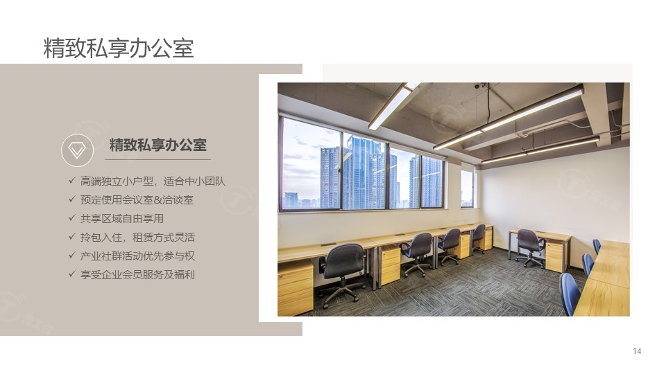 以小团队为主要服务对象,提供以配备完善、即时入驻的办公空间为主体,行政管理、企业增值和成长陪伴服务为配套的一站式办公解决方案,助力企业更灵活、高效地开展商业活动