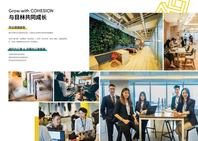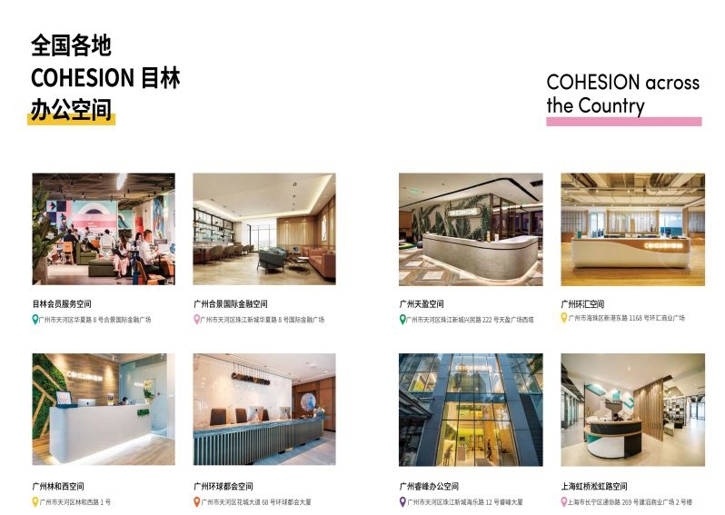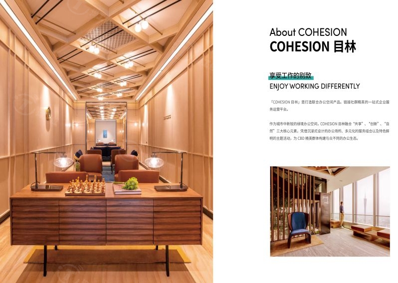 「COHESION目林」是打造联合办公空间产品,链接社群精英的一站式企业服务运营平台。这里融合了“共享”、“创新”、“自然”三大核心元素,为CBD精英群体带来与别不同的办公体验——「Enjoy Working Differently」享受工作的别致。作为城中新锐的绿境办公空间,沉浸式的设计办公场所,多元化的服务组合以及丰富的主题活动,打破了枯燥无味的工作模式,将无甚交集的个体联结为富有协作精神的紧密社群。