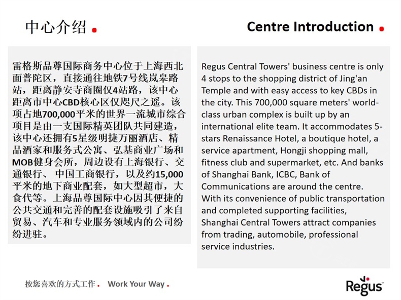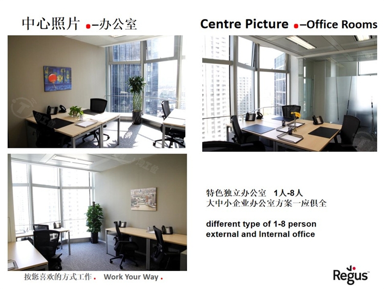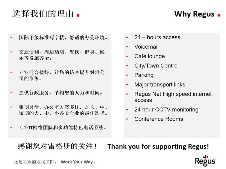 雷格斯(LSE:RGU)是全球领先的工作场所创新解决方案供应商。提供全配办公室,虚拟办公室,专业会议室,商务贵宾室和最大的视频会议演播室网络,并配有非常专业的秘书团队,这使得雷格斯商务中心成为设立新办公地点的快速和经济的解决方案。我们服务理念的关键词是灵活性:租期灵活、租赁面积灵活。雷格斯IWG集团在中国包括北京、上海、广州、深圳、成都、重庆、长沙、大连、杭州、昆明、南京、天津、西安、武汉和台北等近三十个城市,设立了超过140家商务中心。