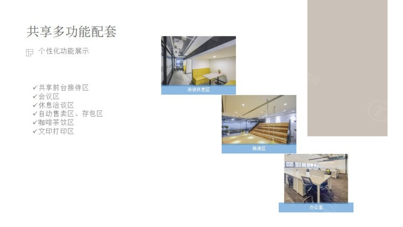 租金包含:前台服务、物管费、家具、水电、咖啡茶水、日常清洁、网络配置、打印复印、会议室