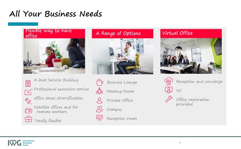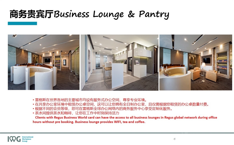 雷格斯(LSE:RGU)是全球领先的工作场所创新解决方案供应商。提供全配办公室,虚拟办公室,专业会议室,商务贵宾室和最大的视频会议演播室网络,并配有非常专业的秘书团队,这使得雷格斯商务中心成为设立新办公地点的快速和经济的解决方案。我们服务理念的关键词是灵活性:租期灵活、租赁面积灵活。雷格斯IWG集团在中国包括北京、上海、广州、深圳、成都、重庆、长沙、大连、杭州、昆明、南京、天津、西安、武汉和台北等近三十个城市,设立了超过140家商务中心。