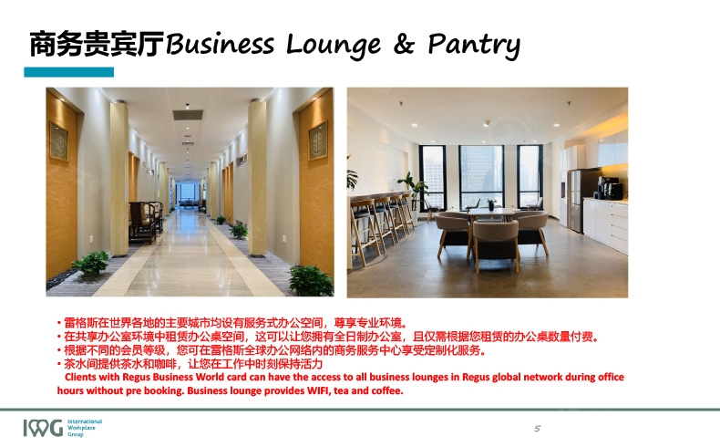 雷格斯(LSE:RGU)是全球领先的工作场所创新解决方案供应商。提供全配办公室,虚拟办公室,专业会议室,商务贵宾室和最大的视频会议演播室网络,并配有非常专业的秘书团队,这使得雷格斯商务中心成为设立新办公地点的快速和经济的解决方案。我们服务理念的关键词是灵活性:租期灵活、租赁面积灵活。雷格斯IWG集团在中国包括北京、上海、广州、深圳、成都、重庆、长沙、大连、杭州、昆明、南京、天津、西安、武汉和台北等近三十个城市,设立了超过140家商务中心。