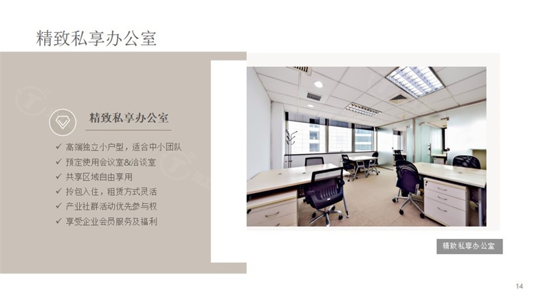 以小团队为主要服务对象,提供以配备完善、即时入驻的办公空间为主体,行政管理、企业增值和成长陪伴服务为配套的一站式办公解决方案,助力企业更灵活、高效地开展商业活动
