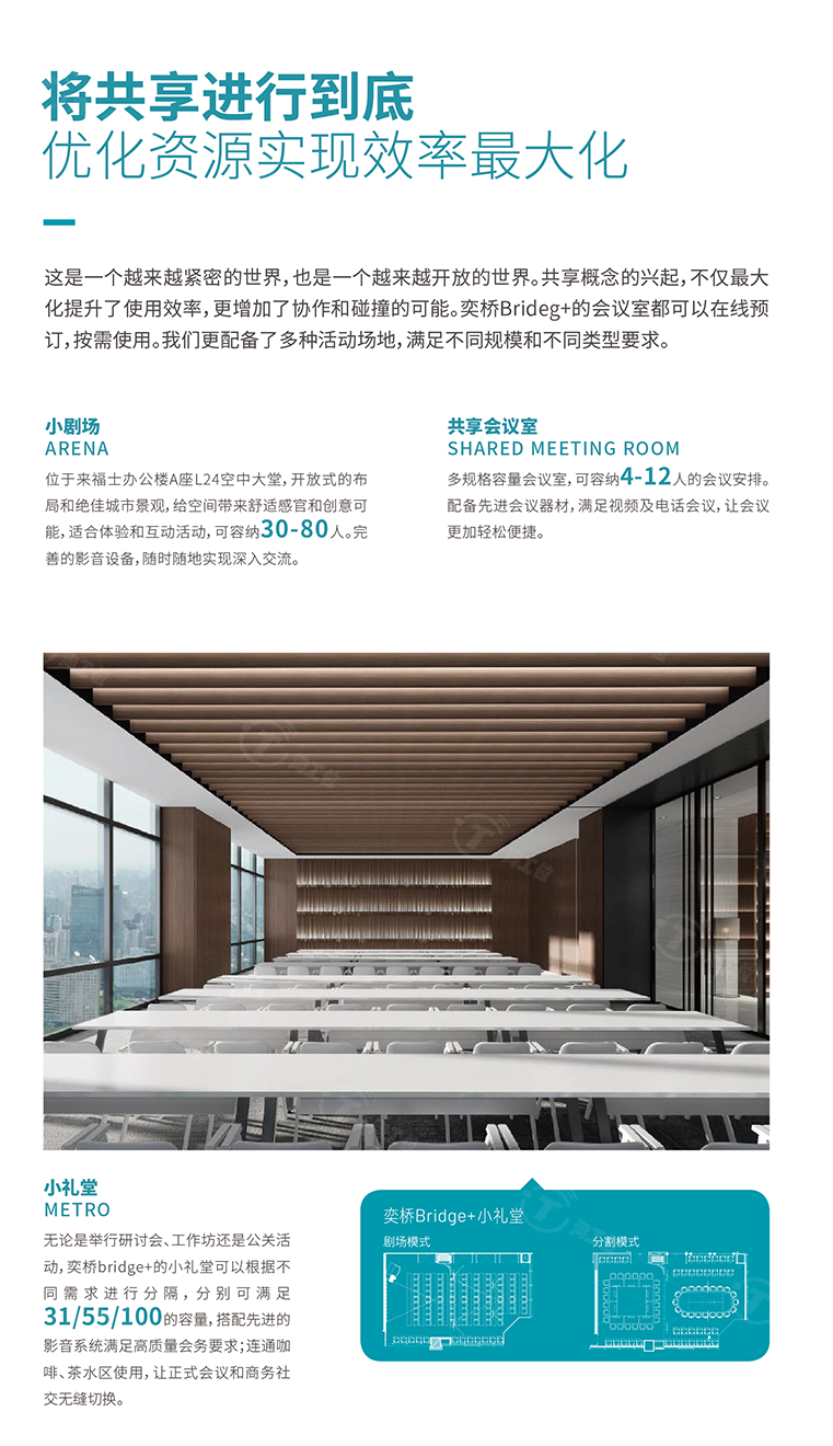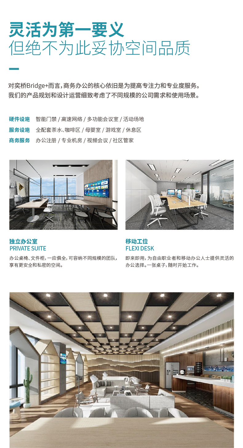 奕桥Bridge+是凯德集团旗下的灵活办公空间和互动社群平台。奕桥不仅是灵活办公和共享设施解决方案的提供者,更是专业又充满活力商务社群的打造者,串联起空间、企业与资源,担负起“桥”的意义。我们旨在一路支持企业的成长,致力于提供企业全生命周期的办公解决方案。奕桥旨在依托集团资源和多年积淀,联结起不同的企业和用户,以空间为据点,以活动为驱动,促成资源的共享和协作的可能,打开更广阔的商务世界。
