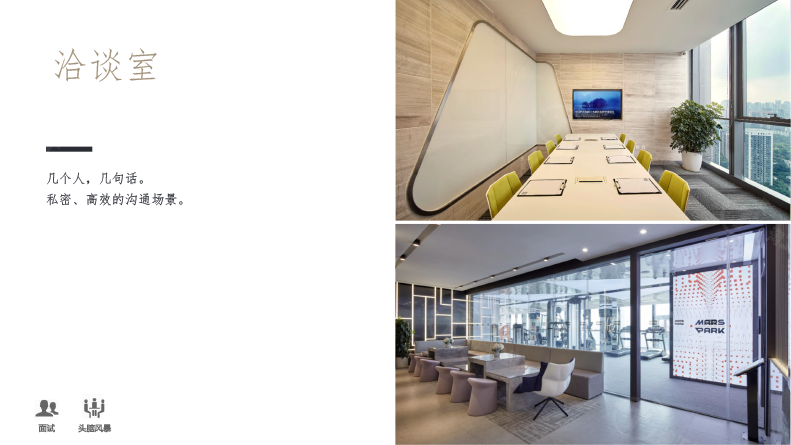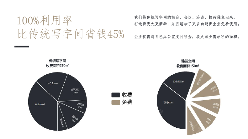 “臻”不同于众创空间和孵化器。我们对极致‘办公体验、企业形象’的追求是永不停歇的。将传统写字间的前台、会议、洽谈、接待独立出来,打造得更大更豪华,并且增加了更多功能供企业免费使用。企业仅需对自己办公室支付租金,极大减少需承租的面积。