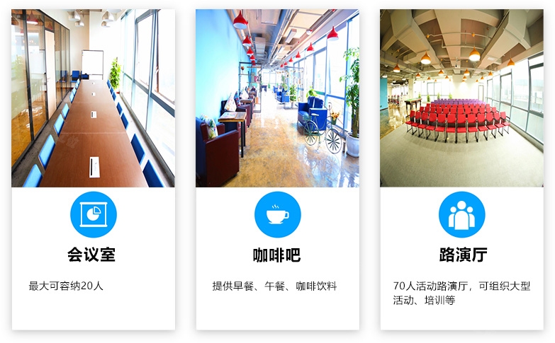 · 配备有会议室、路演厅、咖啡厅、休闲洽谈区(投影、音响、话筒等设备齐全)
